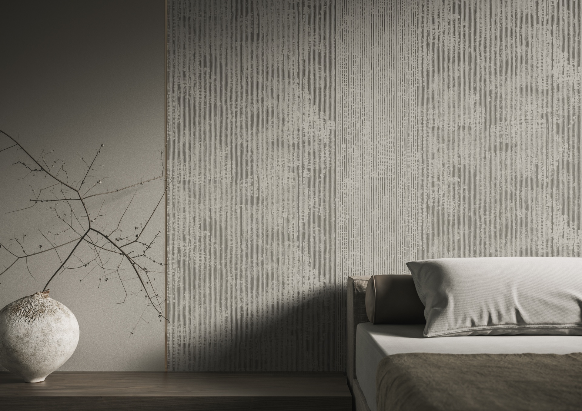 GlamOrigin je prémiová strukturovaná tapeta s trojrozměrným povrchem, která přináší do interiérového designu estetiku sochařského betonu v moderním pojetí. Tapeta je vyrobena vrstvením monokrystalických křemenných písků na netkaný podklad, což zajišťuje vysokou kvalitu, trvanlivost a přírodní vzhled. Jemné minerální usazeniny a mírné barevné odchylky jsou záměrnou součástí designu – výsledkem je unikátní přírodní povrch, ideální pro luxusní a nadčasové interiéry.